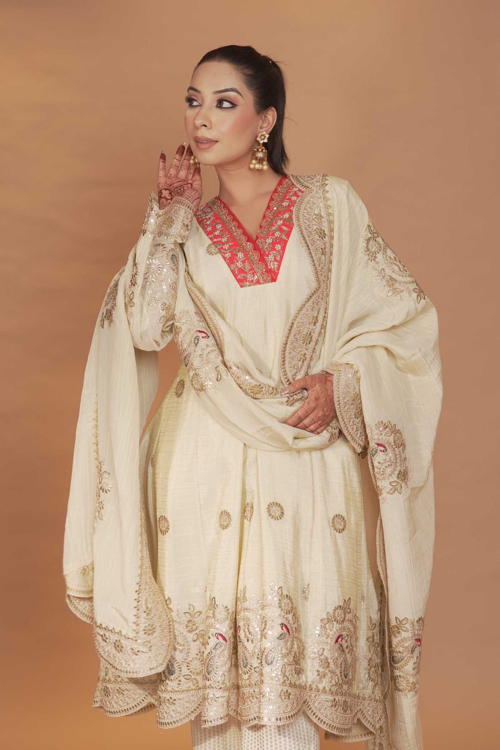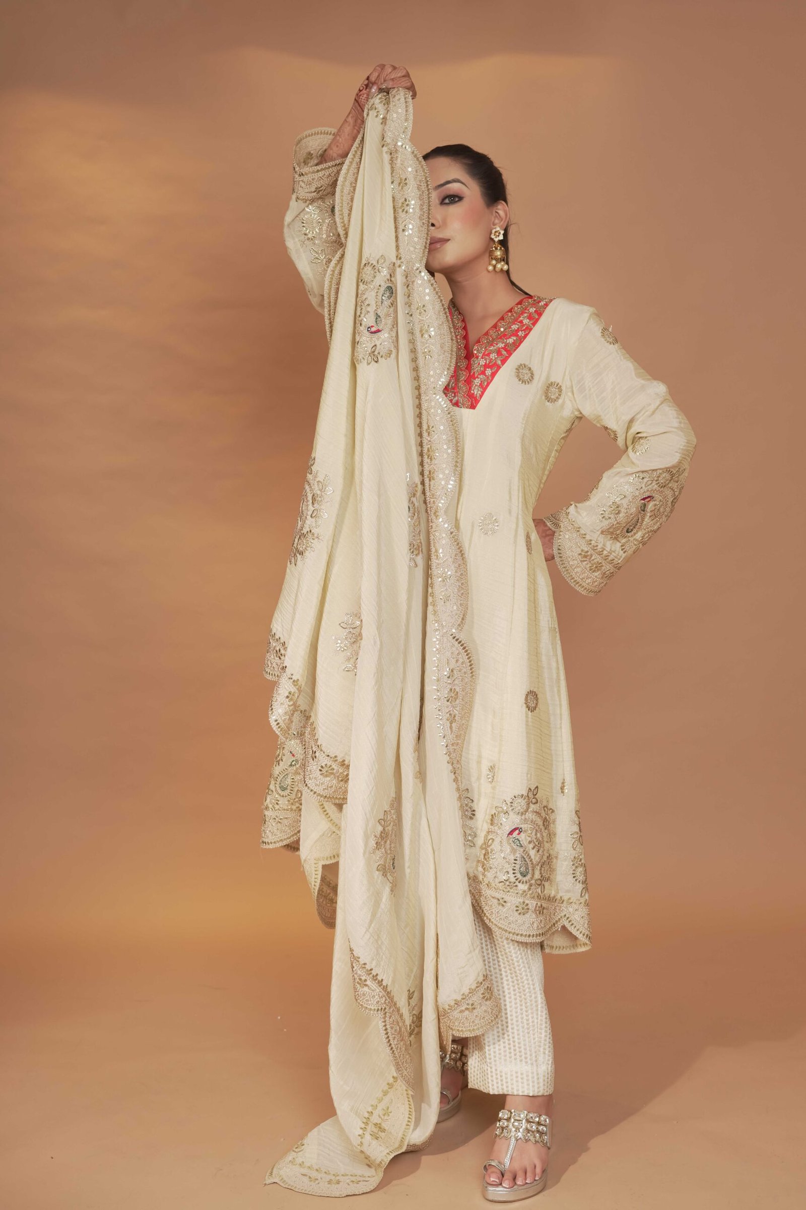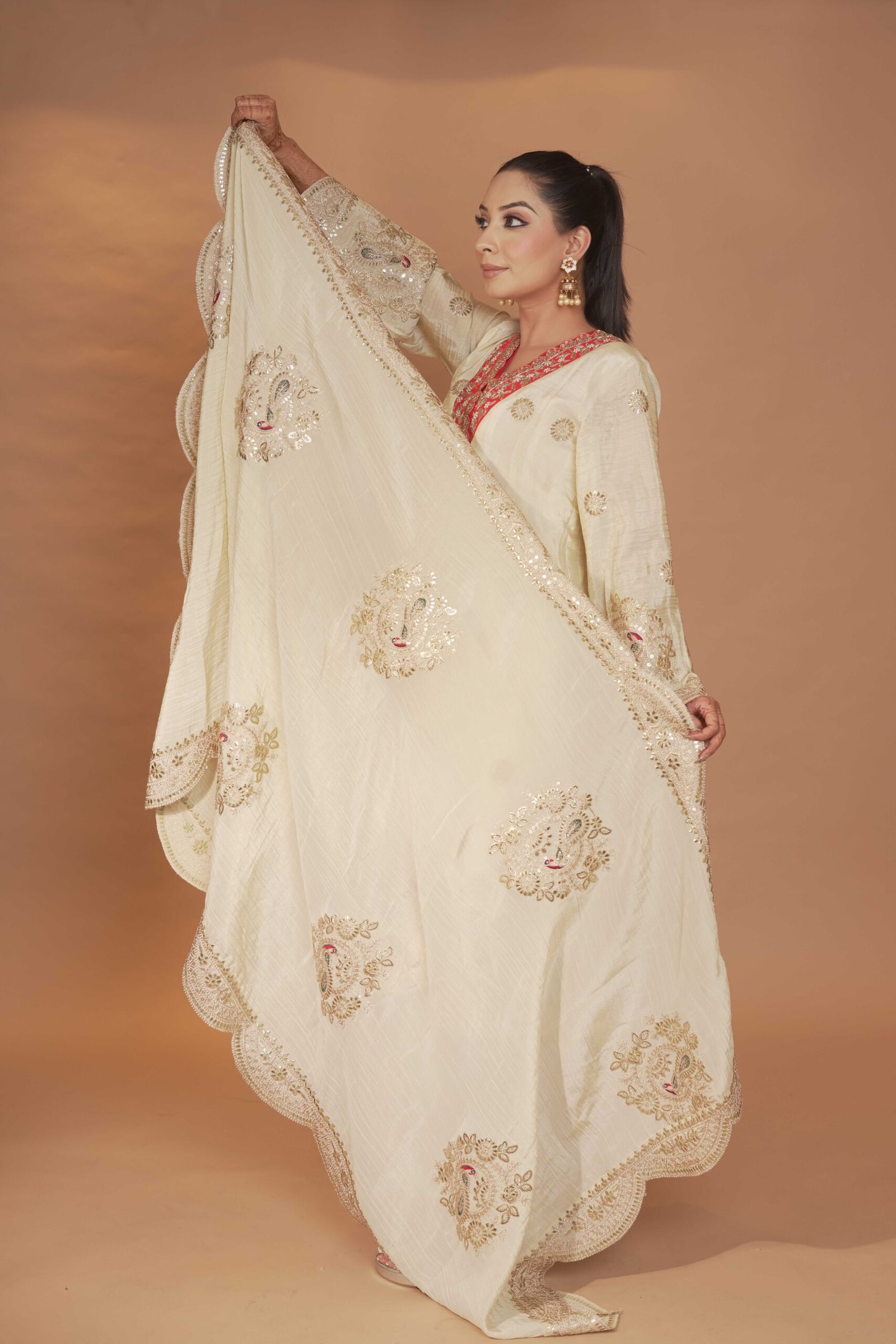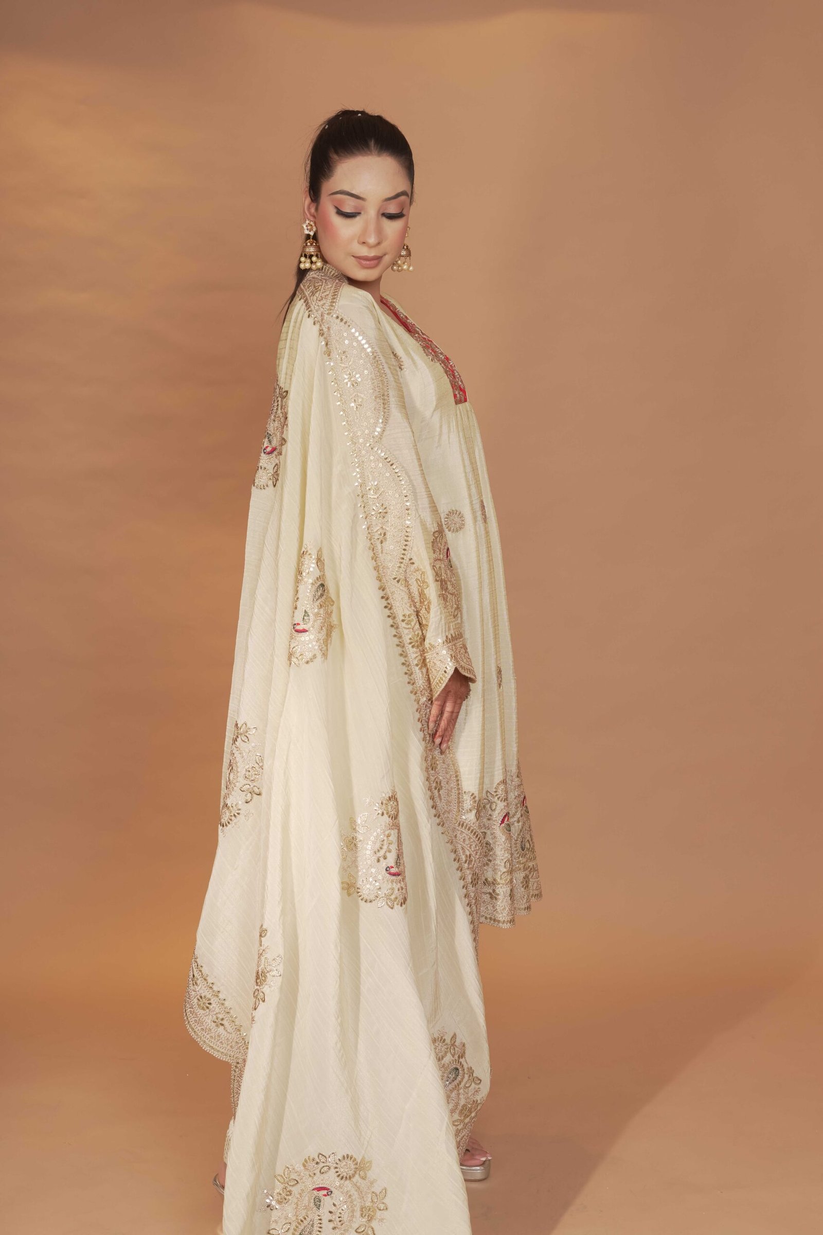 Dry Clean Only. These garments are delicate and feature hand embroidery, so professional dry cleaning is strongly recommended to maintain their quality and finish. Store in a cool, dry place away from direct sunlight. Avoid spraying perfume or cologne directly on the fabric, as this may cause staining or discoloration. Keep garments away from water and rain, as moisture can damage the fabric and hand embroidery.
