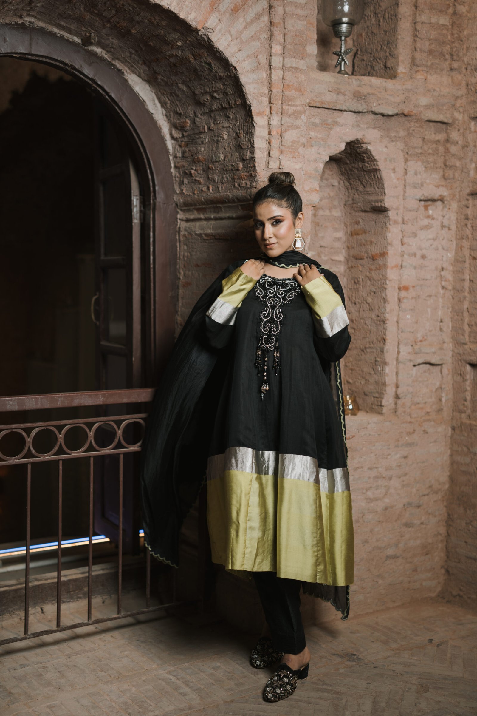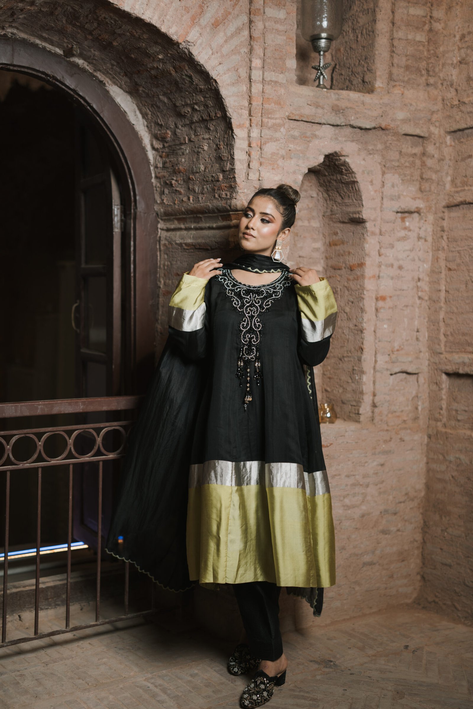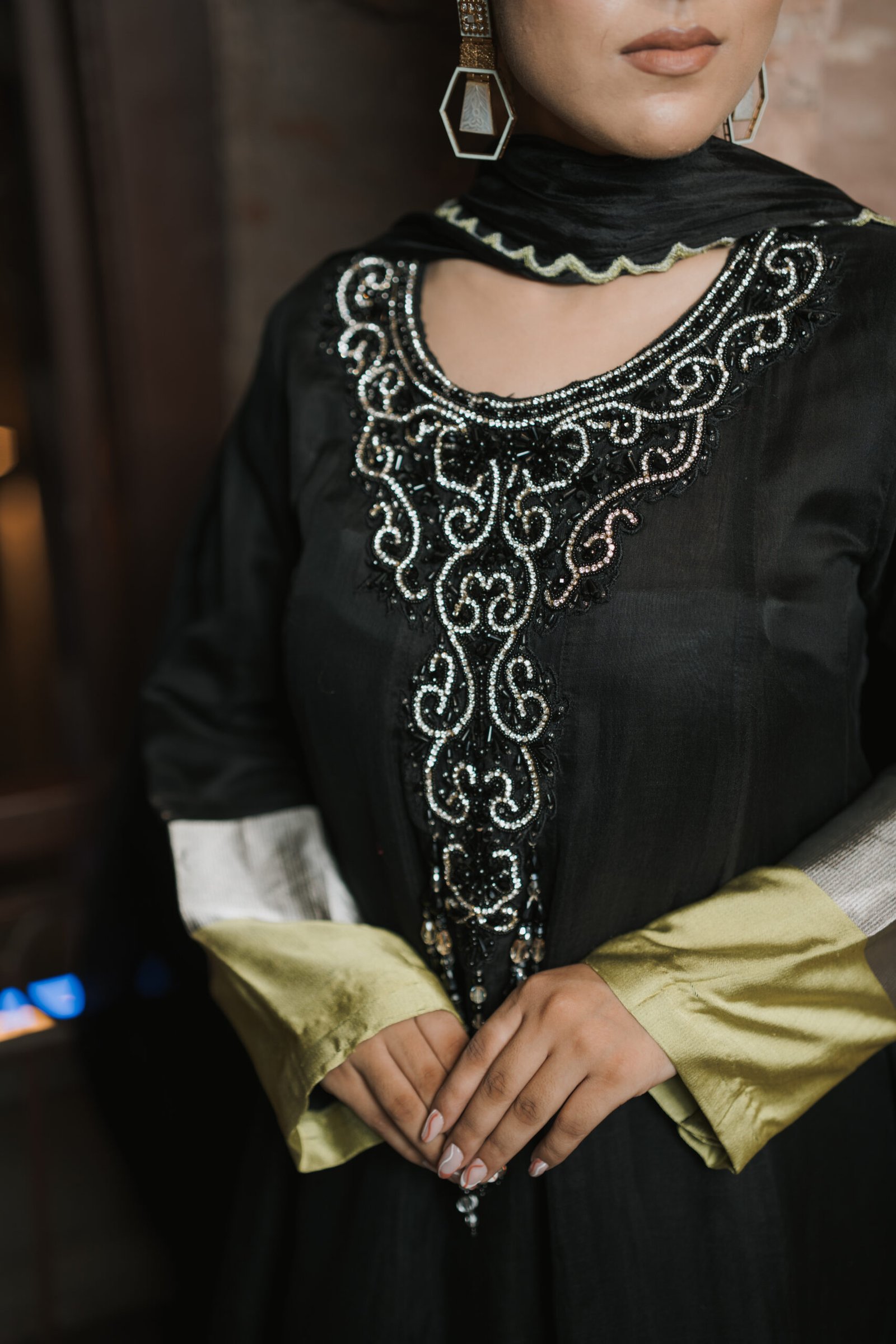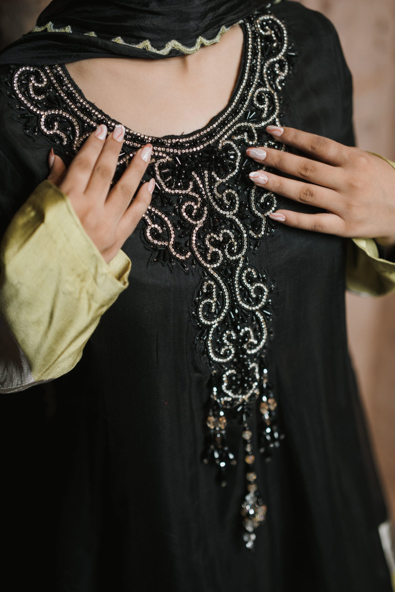 Dry Clean Only. These garments are delicate and feature hand embroidery, so professional dry cleaning is strongly recommended to maintain their quality and finish. Store in a cool, dry place away from direct sunlight. Avoid spraying perfume or cologne directly on the fabric, as this may cause staining or discoloration. Keep garments away from water and rain, as moisture can damage the fabric and hand embroidery.