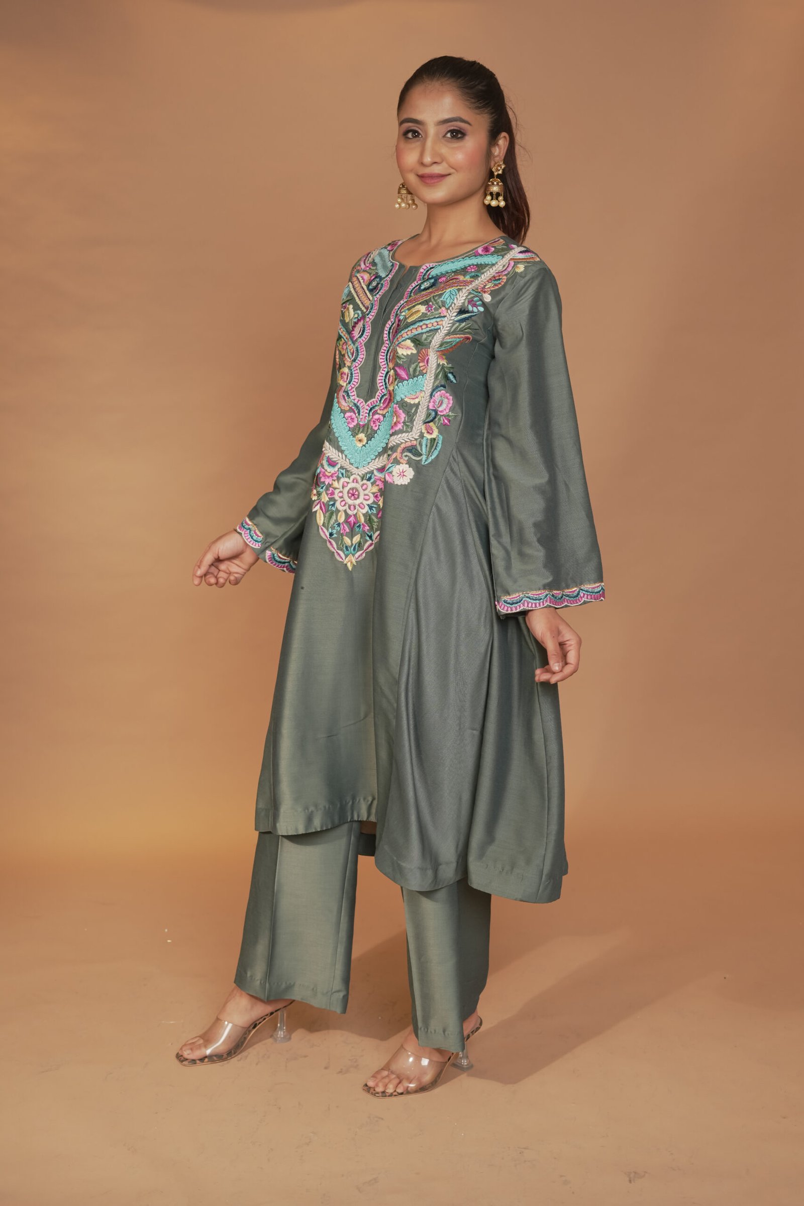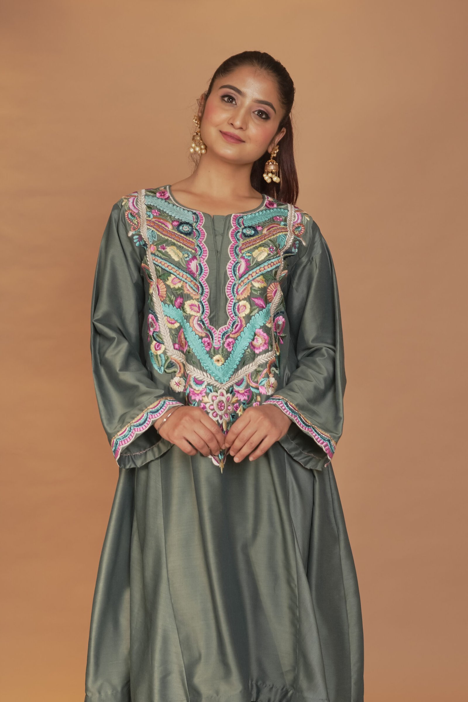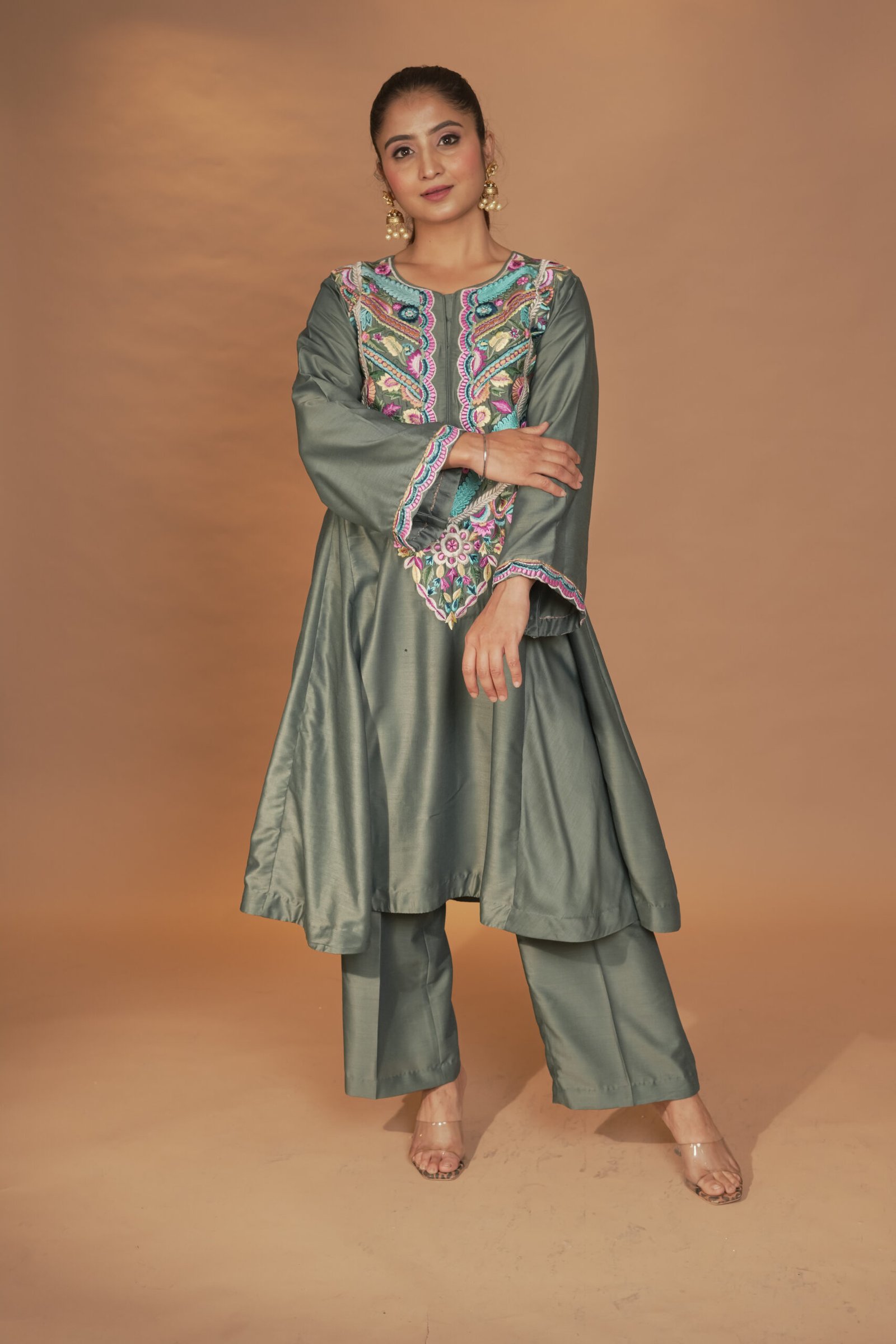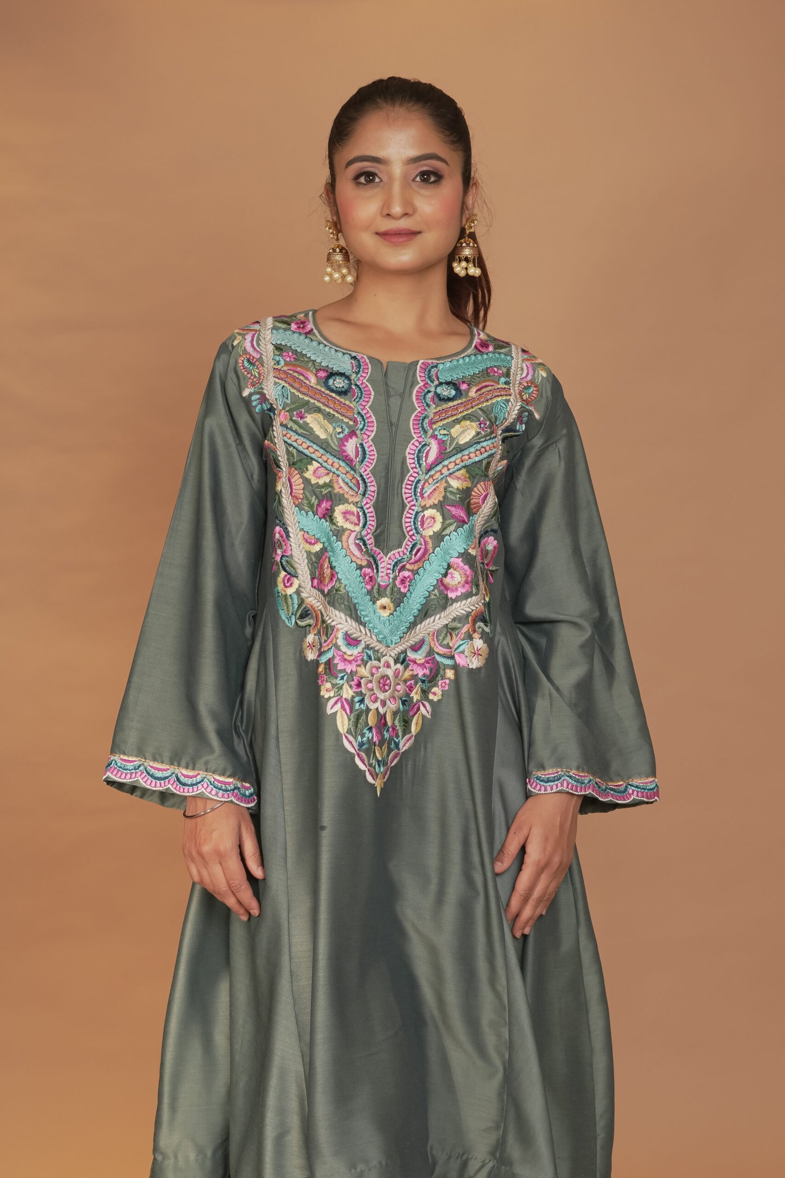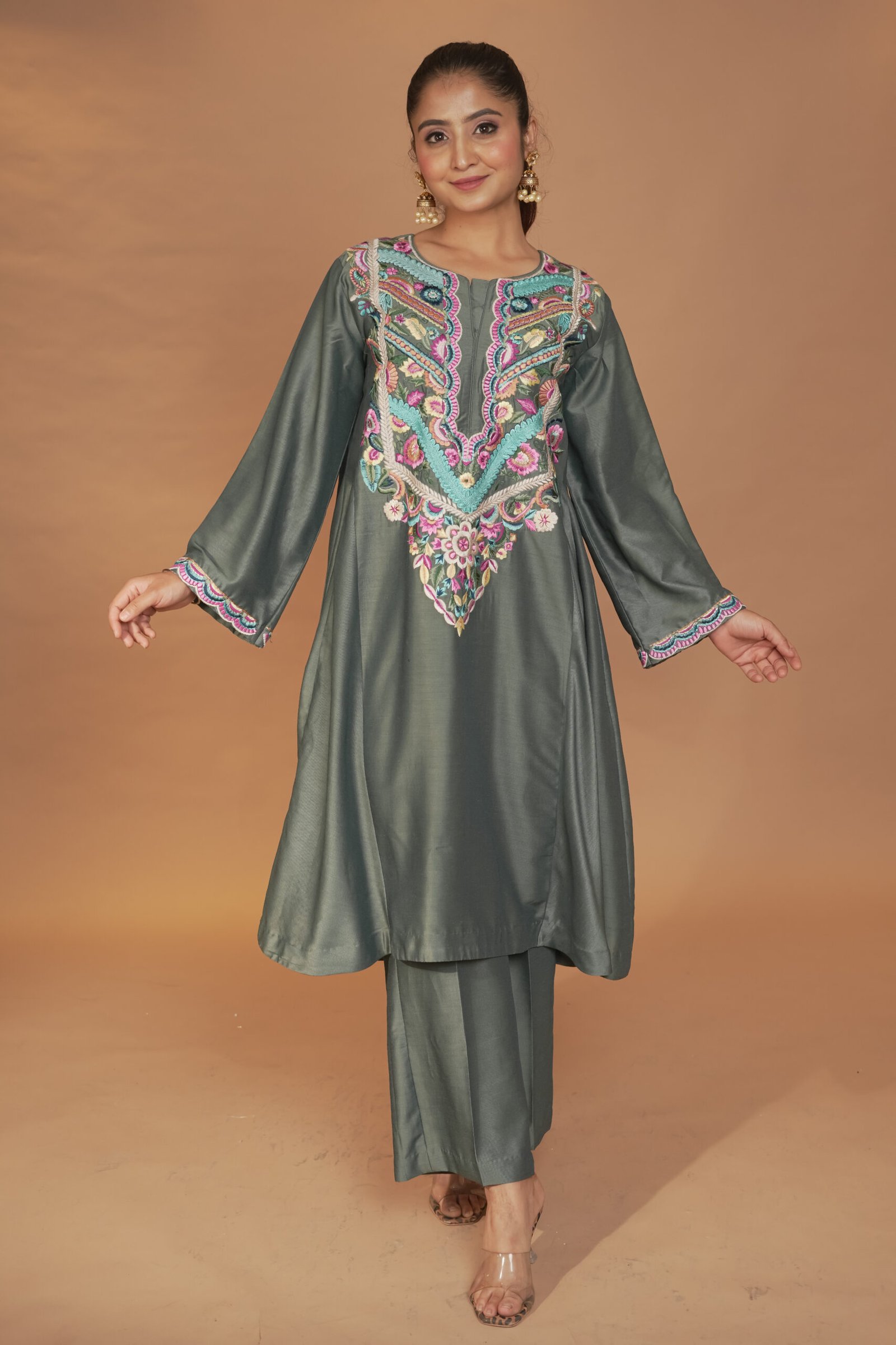 Dry Clean Only. These garments are delicate and feature hand embroidery, so professional dry cleaning is strongly recommended to maintain their quality and finish. Store in a cool, dry place away from direct sunlight. Avoid spraying perfume or cologne directly on the fabric, as this may cause staining or discoloration. Keep garments away from water and rain, as moisture can damage the fabric and hand embroidery.